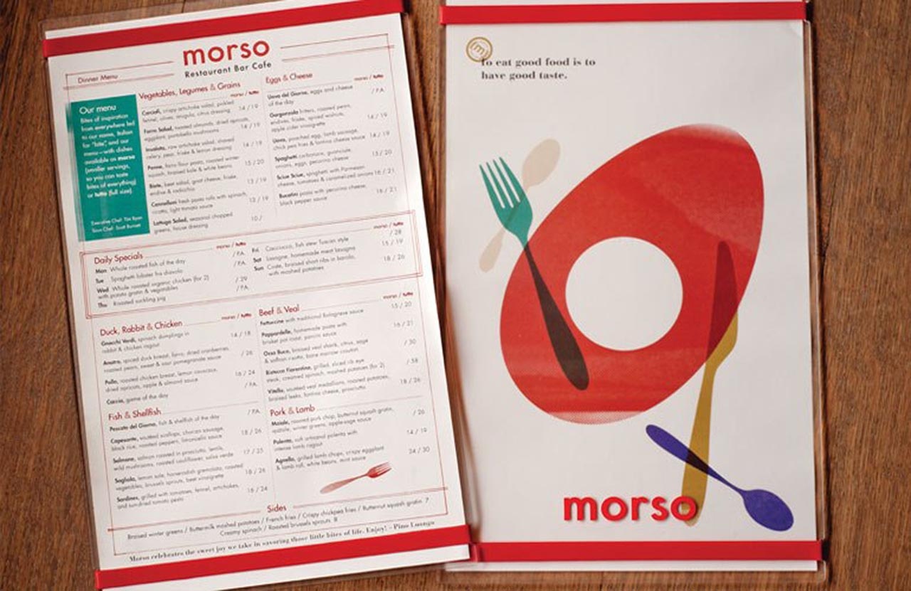 就像家庭式的菜肴一樣,我們想要設(shè)計一個讓人感到舒適和放松的空間。菜單簡短而充滿活力,可以保持對話流暢。我們用大膽,明亮的海報填充墻壁,并飾有厚厚的厚臉皮,如“嘴里滿是沉默的金色”和“吃,喝,做Morso。”這是一種食客所喜愛的氛圍,適合廚師Pino豐富多彩的氛圍。個性完美。